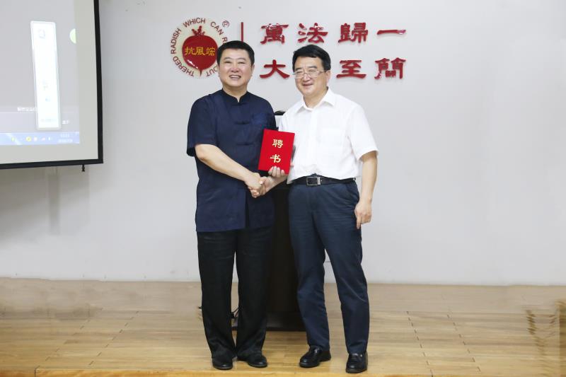 藥科大學(xué)副校長(zhǎng)程卯生(右)為抗風(fēng)竤董事長(zhǎng)張芮袀(左)頒發(fā)聘書