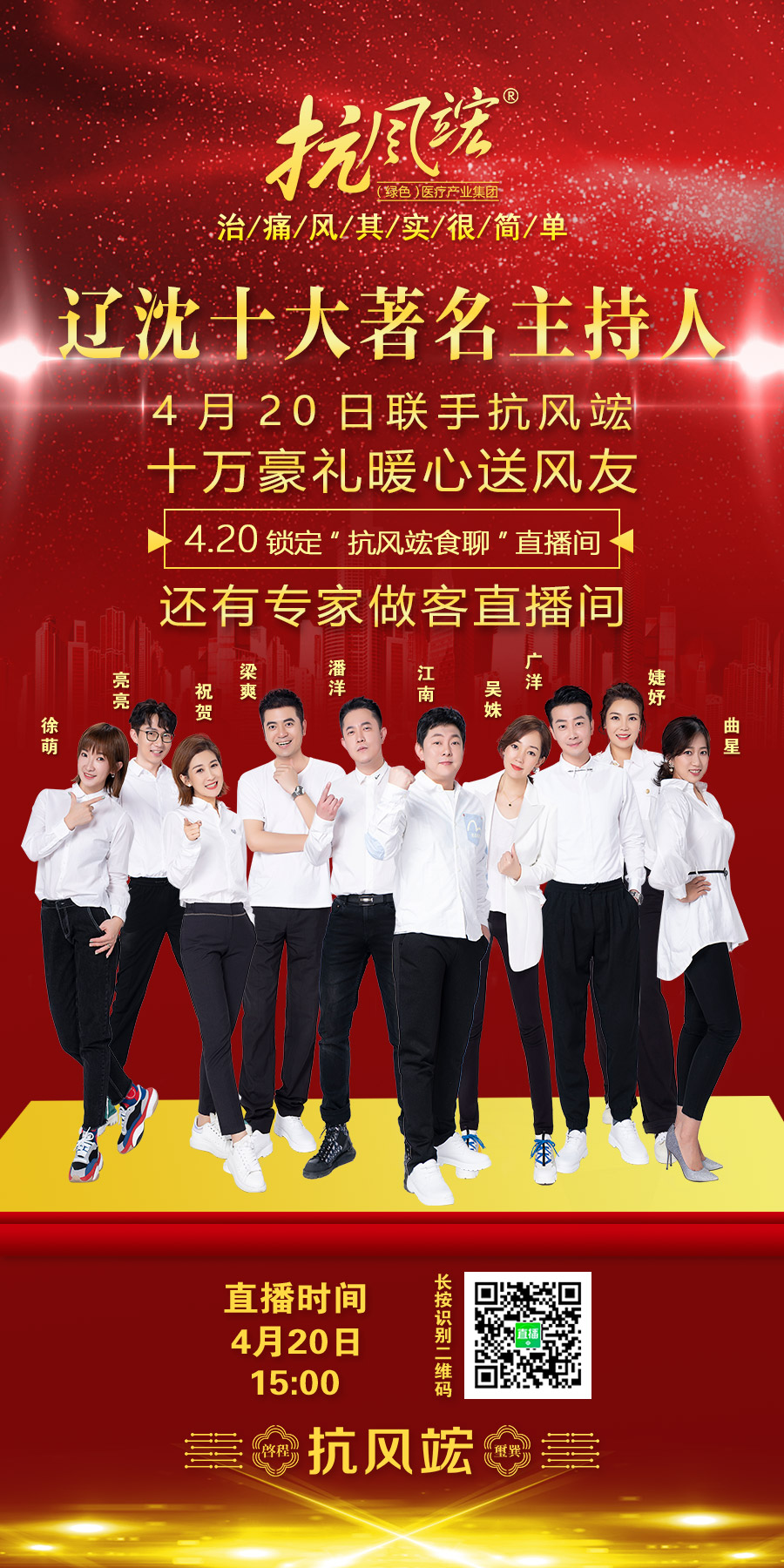 活動當(dāng)天,有播、騰訊直播、抖音等多家直播平臺將對活動進行全程直播,遼沈地區(qū)十大著名主持人吳姝、祝賀、江南、潘洋、梁爽、曲星、婕妤、廣洋、亮亮、徐萌等悉數(shù)來到沈陽抗風(fēng)竤中醫(yī)門診,與抗風(fēng)竤醫(yī)療產(chǎn)業(yè)集團董事長張汭鈞、總裁程莉琂共同啟動全國十大“抗風(fēng)斗士”評選活動,同時為全國各地的痛風(fēng)患者傾情獻愛心,十萬豪禮大放送。