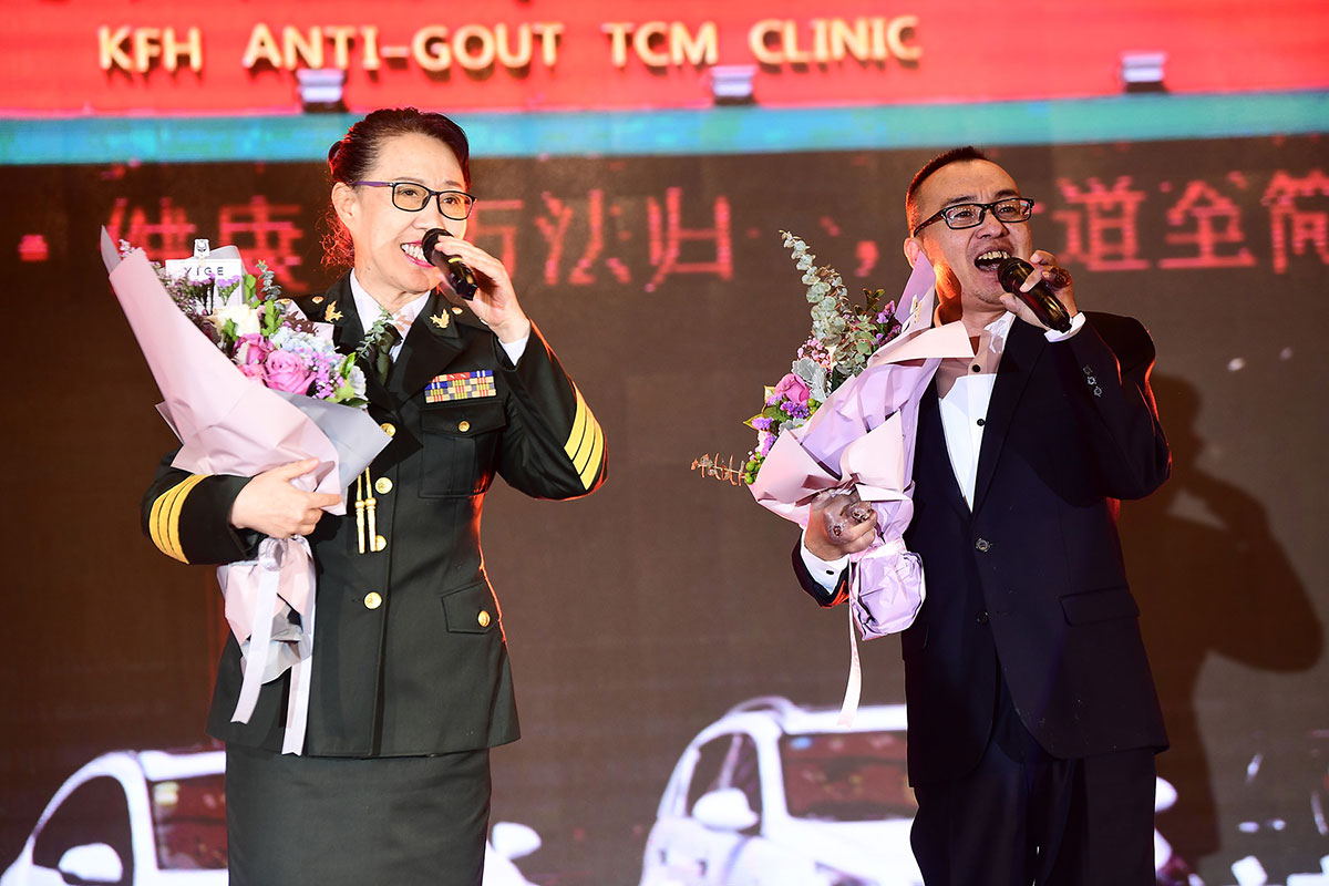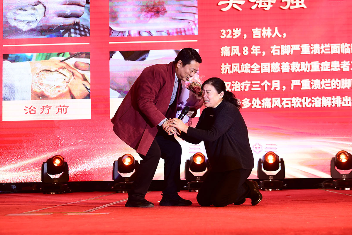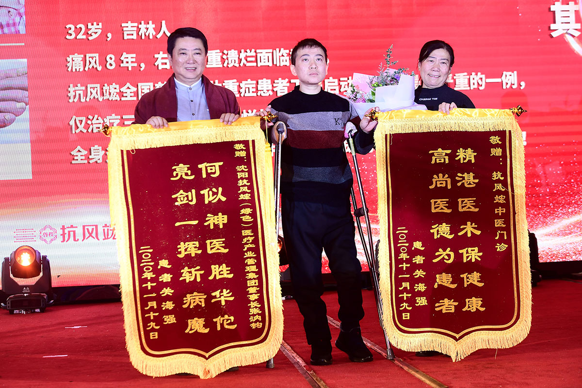 慶典現(xiàn)場最感人的一幕要數(shù)兩位“抗風(fēng)斗士”葛晟杰和關(guān)海強(qiáng)登臺分享一路與痛風(fēng)抗?fàn)幍男穆窔v程。他們都是風(fēng)華正茂,卻備受痛風(fēng)折磨,在遇到抗風(fēng)竤之前,幾乎都瀕臨絕望。來自山東的25歲葛晟杰,痛風(fēng)七年、癱瘓三年,經(jīng)過在抗風(fēng)竤門診的系統(tǒng)治療后,丟掉輪椅和雙拐,自己走上了舞臺;關(guān)海強(qiáng)更是在被多家三甲醫(yī)院診斷“不截肢就有生命危險”,并且還面臨著多臟器衰竭的風(fēng)險,抗風(fēng)竤醫(yī)療集團(tuán)張汭鈞董事長冒著極大的風(fēng)險,向他伸出救助之手。如今的關(guān)海強(qiáng)不僅恢復(fù)了生命活力,而且還走上舞臺為大家吉他彈唱,重獲新生的他最想感激的就是張汭鈞董事長、程莉琂總裁以及全體抗風(fēng)竤人給了他重獲健康的希望!