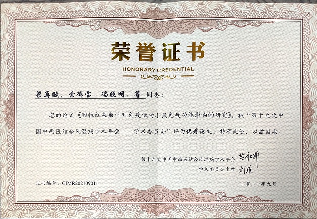 我集團(tuán)科研專家組向“第十九屆中西醫(yī)結(jié)合風(fēng)濕免疫年會(huì)”的3篇投稿論文全部進(jìn)入年會(huì)論文集,其中《雌性紅萊菔葉對(duì)免疫低功小鼠免疫功能影響的研究》一文被評(píng)為優(yōu)秀